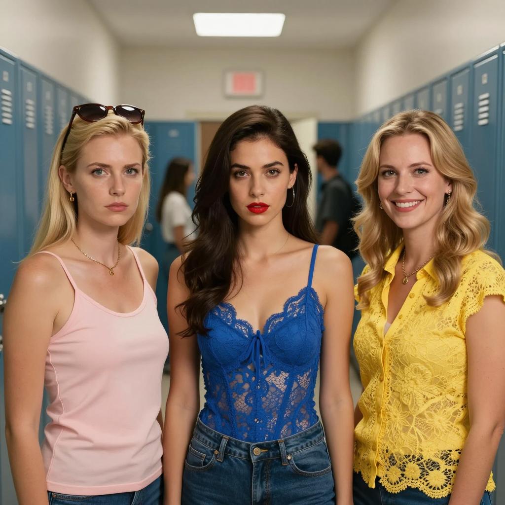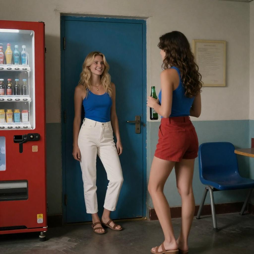 Two women in a dimly lit, worn-out room. One with long blonde hair, wearing a blue tank top and white pants, stands beside a blue door, smiling. The other, topless with brown hair, wears red shorts and brown sandals, facing her, holding a bottle. Red vending machine and blue chair in background.