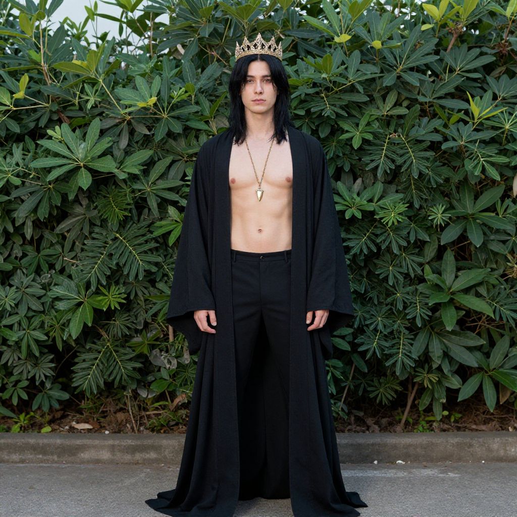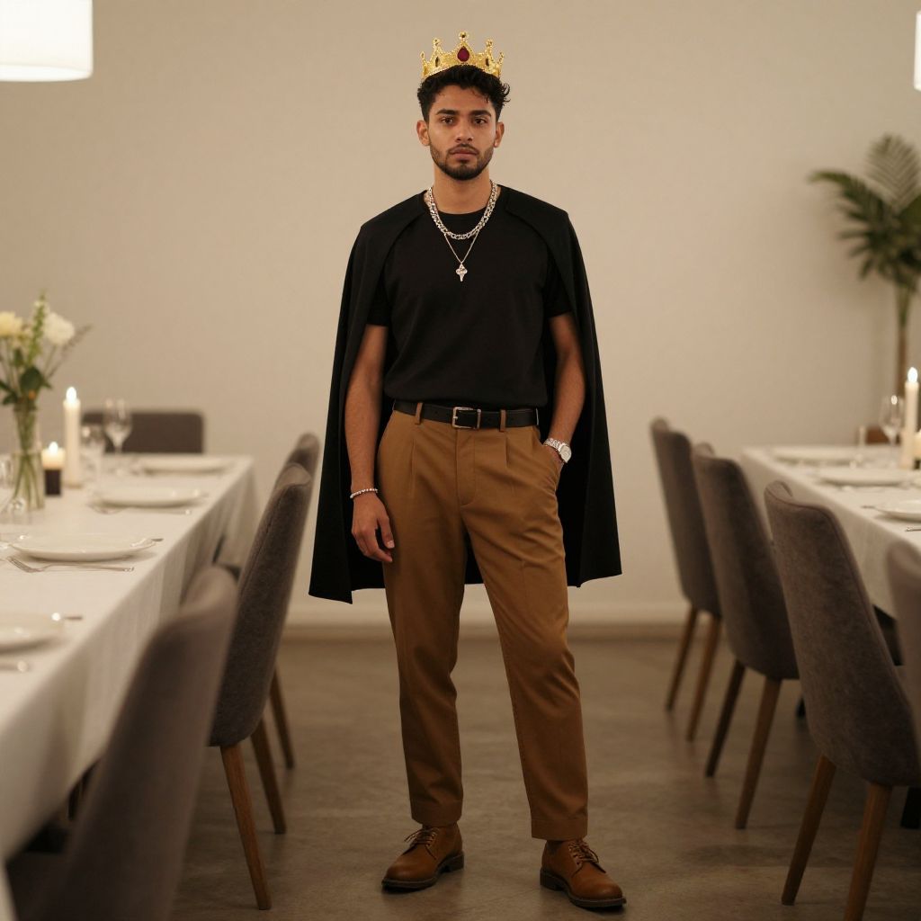 "man dark prince costume, 1boy, solo, male focus, crown, pants, standing, shirt, belt, cape, black hair, curtains, blue shirt, full body, black pants, looking at viewer, facial hair, boots, long sleeves, necklace, shoes, black footwear Realistic photo of casual sexy person with pretty face"