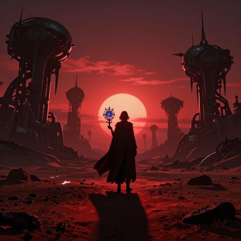 A digital art composition capturing the essence of dark surrealism, featuring an enigmatic solitary figure adorned in a flowing cloak standing on a desolate alien terrain surrounded by towering mechanical constructs. The traveler holds an ancient cosmic relic that emits a haunting glow, casting elongated shadows across the barren landscape. As the sun descends, blood-red hues illuminate the alien terrain, creating a dramatic contrast with the ominous machinery and evoking a sense of isolation and wonder in this surreal yet strikingly realistic environment.