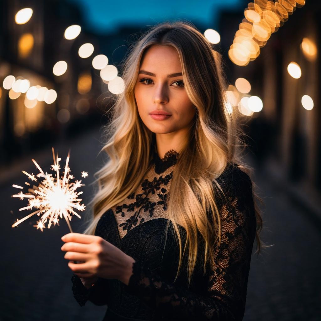 Portrait of a young woman with long blonde hair wearing a black lace dress holding a lit sparkler outdoors at night. The background features warm cinematic bokeh lights and a dark city street atmosphere, creating a moody and festive ambiance.