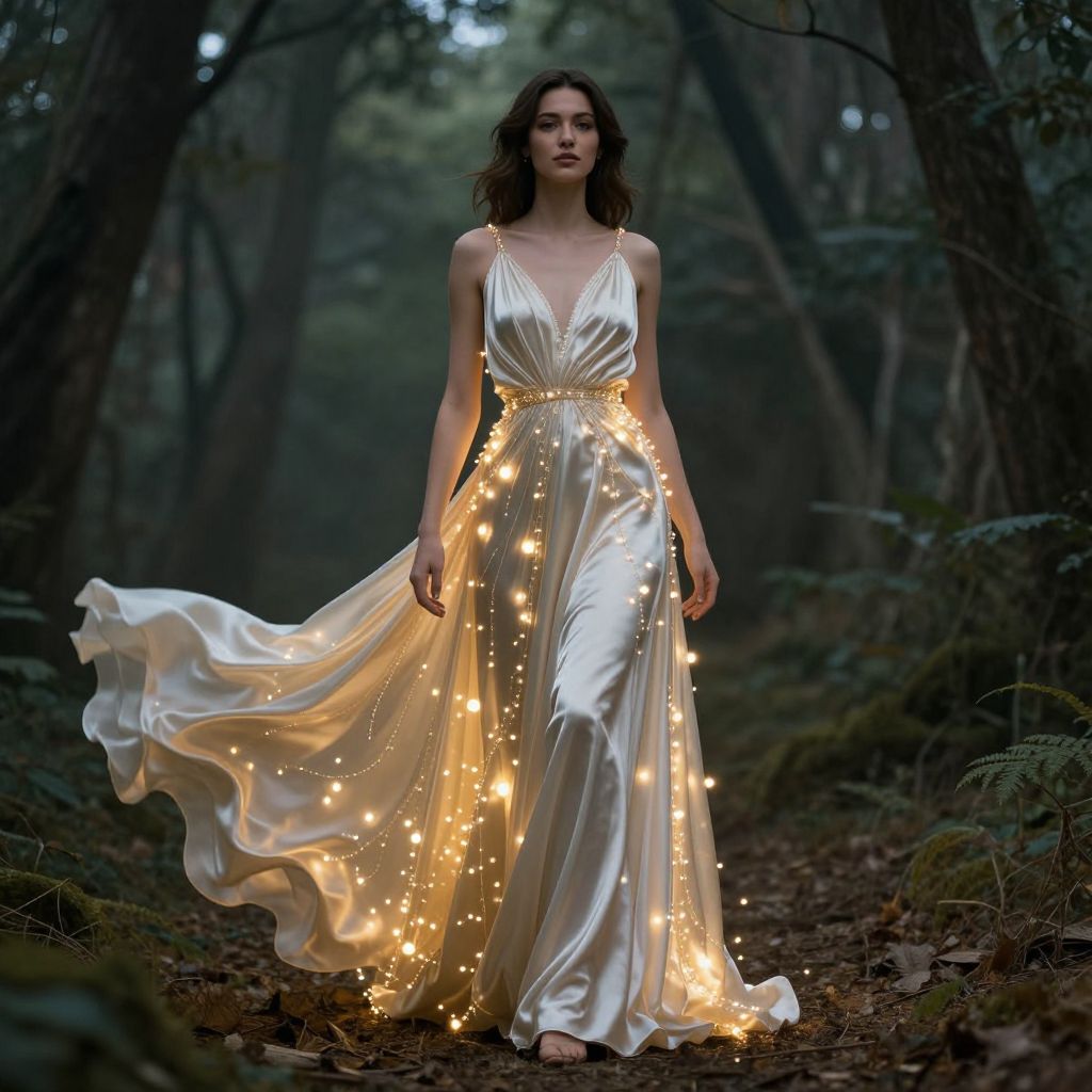 A digitally rendered, ethereal scene depicts a woman standing amidst a forest, adorned in a luxurious silk dress illuminated by warm, glowing lights that cascade down its flowing fabric, symbolizing the emotional resonance between observer and garment, crafted in a dreamlike, fantasy-inspired artistic style.