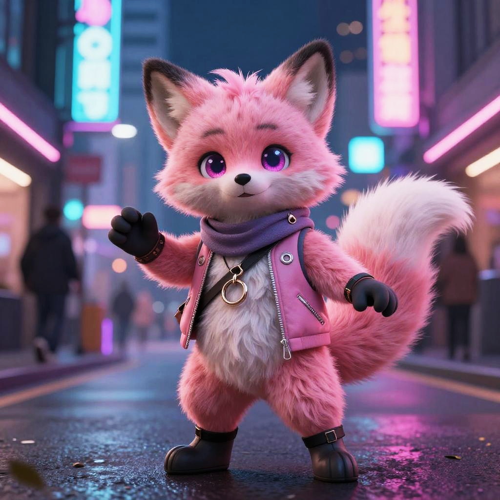 Pink furry art of a playful anthropomorphic fox with vibrant pink fur, expressive eyes, and stylish accessories, standing in an urban neon-lit street at night, dynamic pose