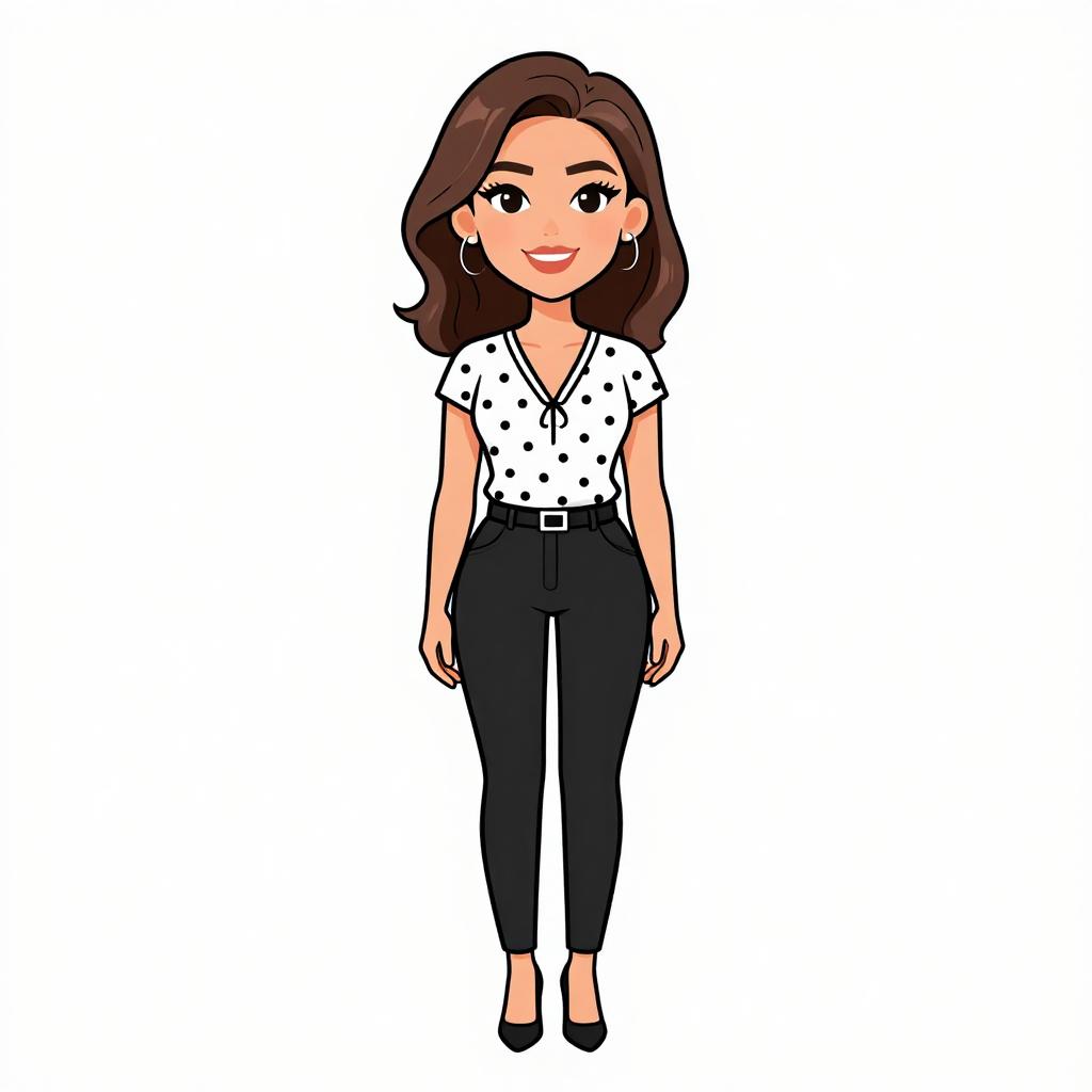 Woman with pretty face and pretty hair. smiling Woman, business casual, white blouse with black polka dots, short sleeves, lace-up detail at the v-neck, tailored black trousers, ankle-length, slim fit, tan heeled pumps, thin black belt with small buckle. --sref 1467