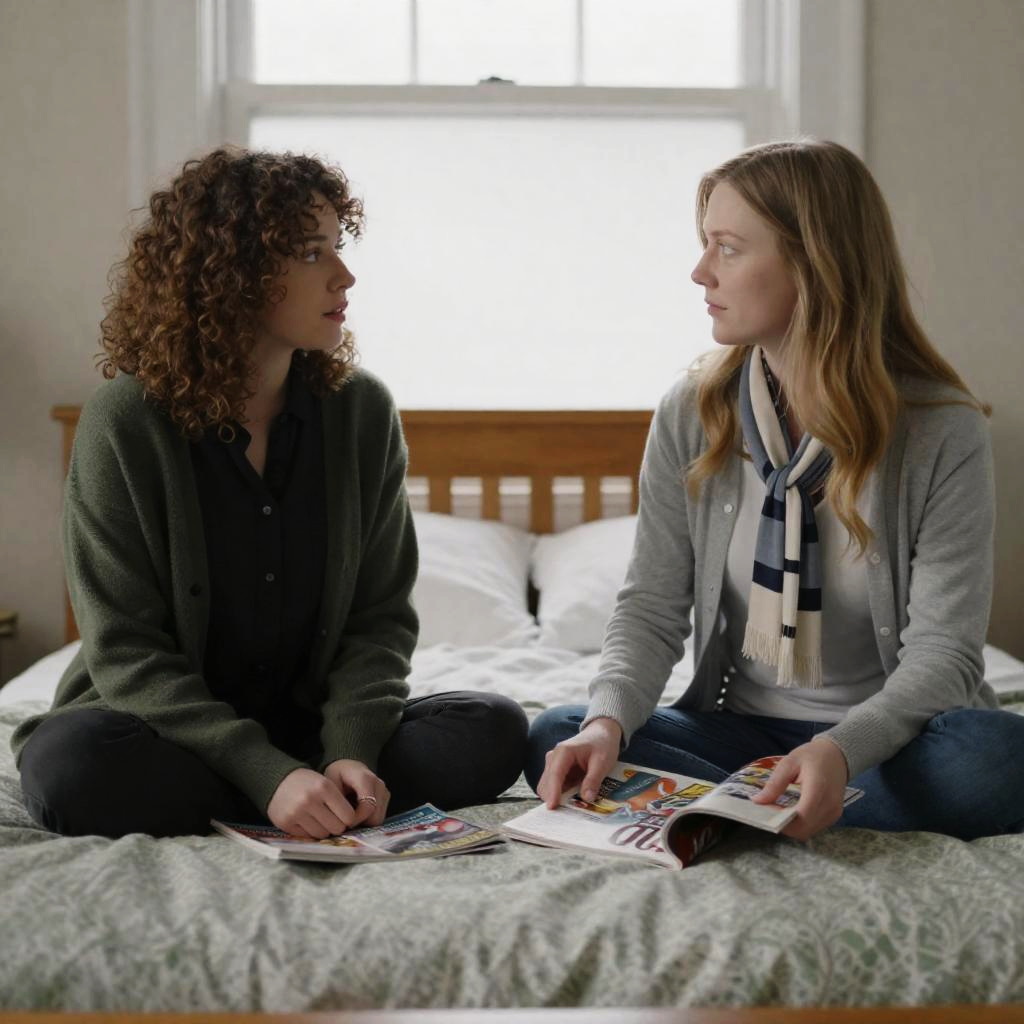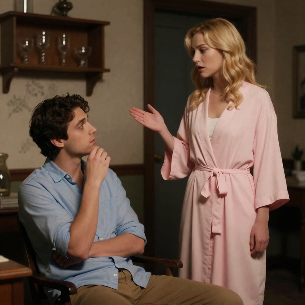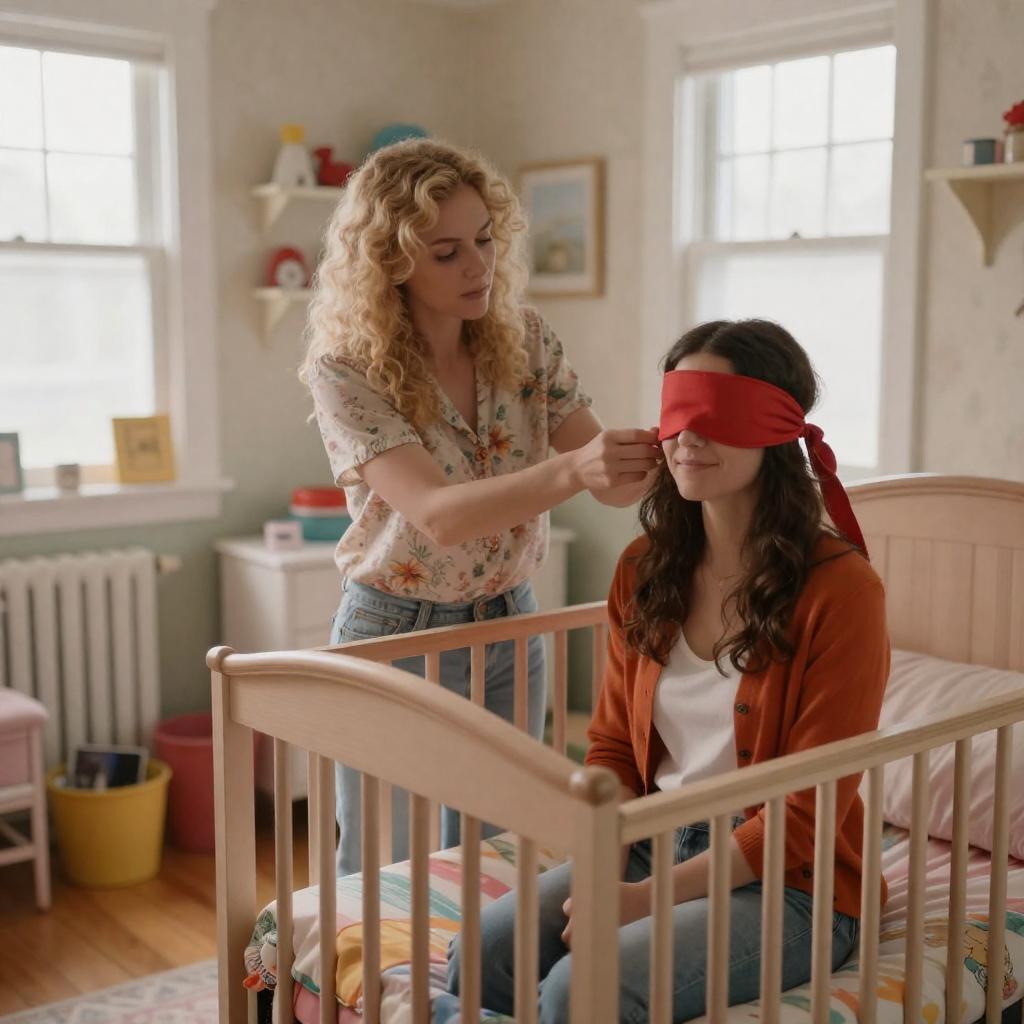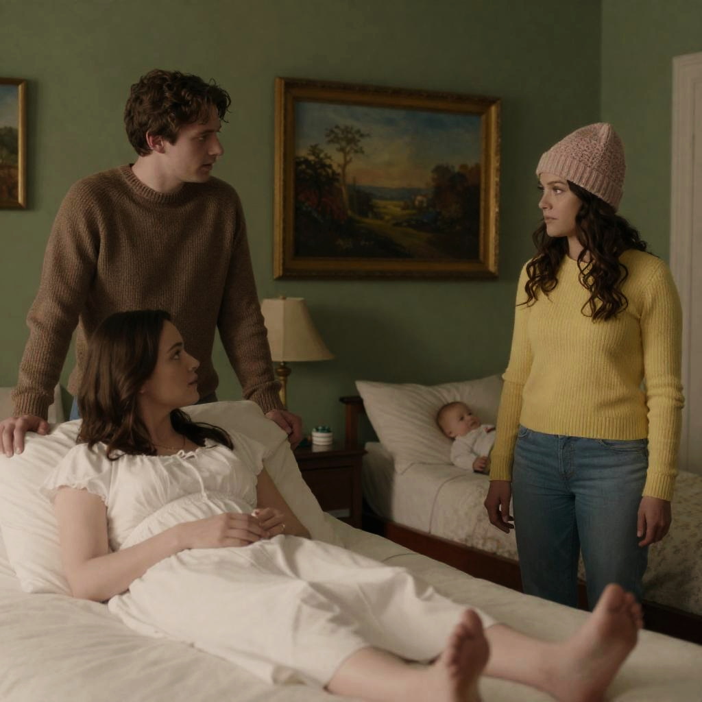 Movie still. Bedroom scene with green walls, framed painting, bed with white sheets, woman in bed with brown hair, white nightgown, man in brown sweater standing left, woman in yellow sweater and hat standing right, baby in bed, bedside lamp.