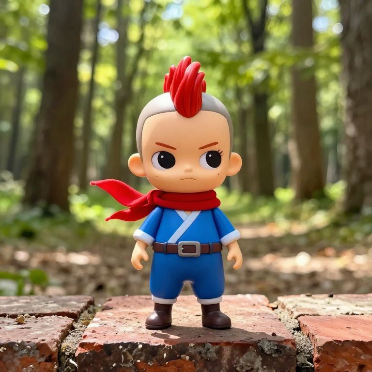A detailed doll with a red mohawk standing on a weathered brick surface, wearing a vibrant blue outfit with a brown belt and a red scarf wrapped around its neck. The doll has large, expressive eyes and a slightly tilted head, giving it a playful and curious demeanor. The background features a lush forest of tall trees with soft green leaves, sunlight filtering through the canopy, creating dappled patterns on the ground. The scene is set in a sunny, slightly whimsical outdoor environment with a warm, nostalgic atmosphere.