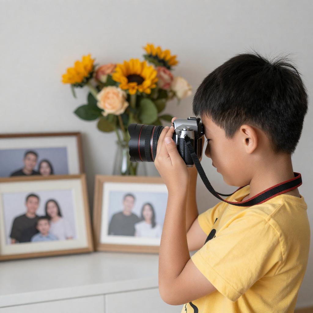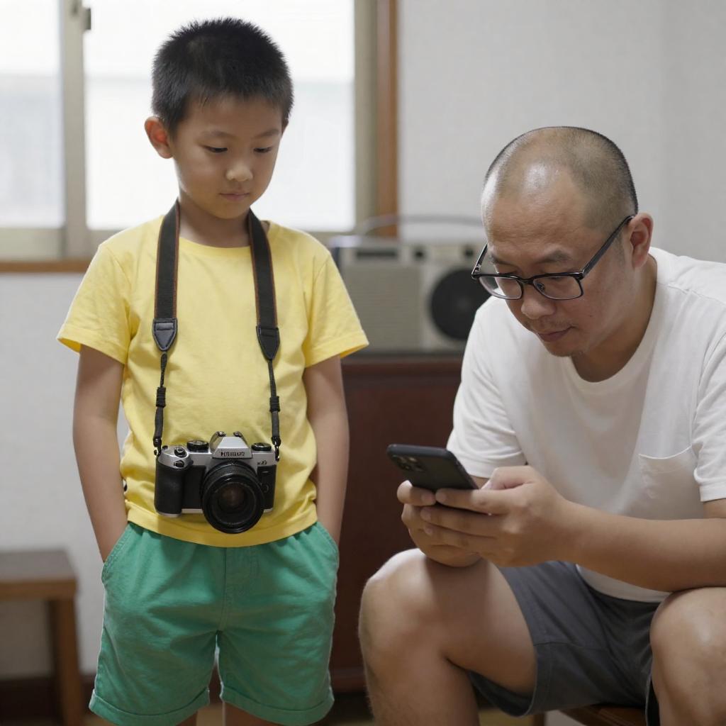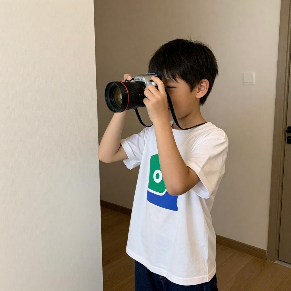 Asian boy in white T-shirt with blue and green patterns, holding camera up to his face, standing in doorway, wooden floor, beige walls, looking through camera lens, short black hair, indoor setting.