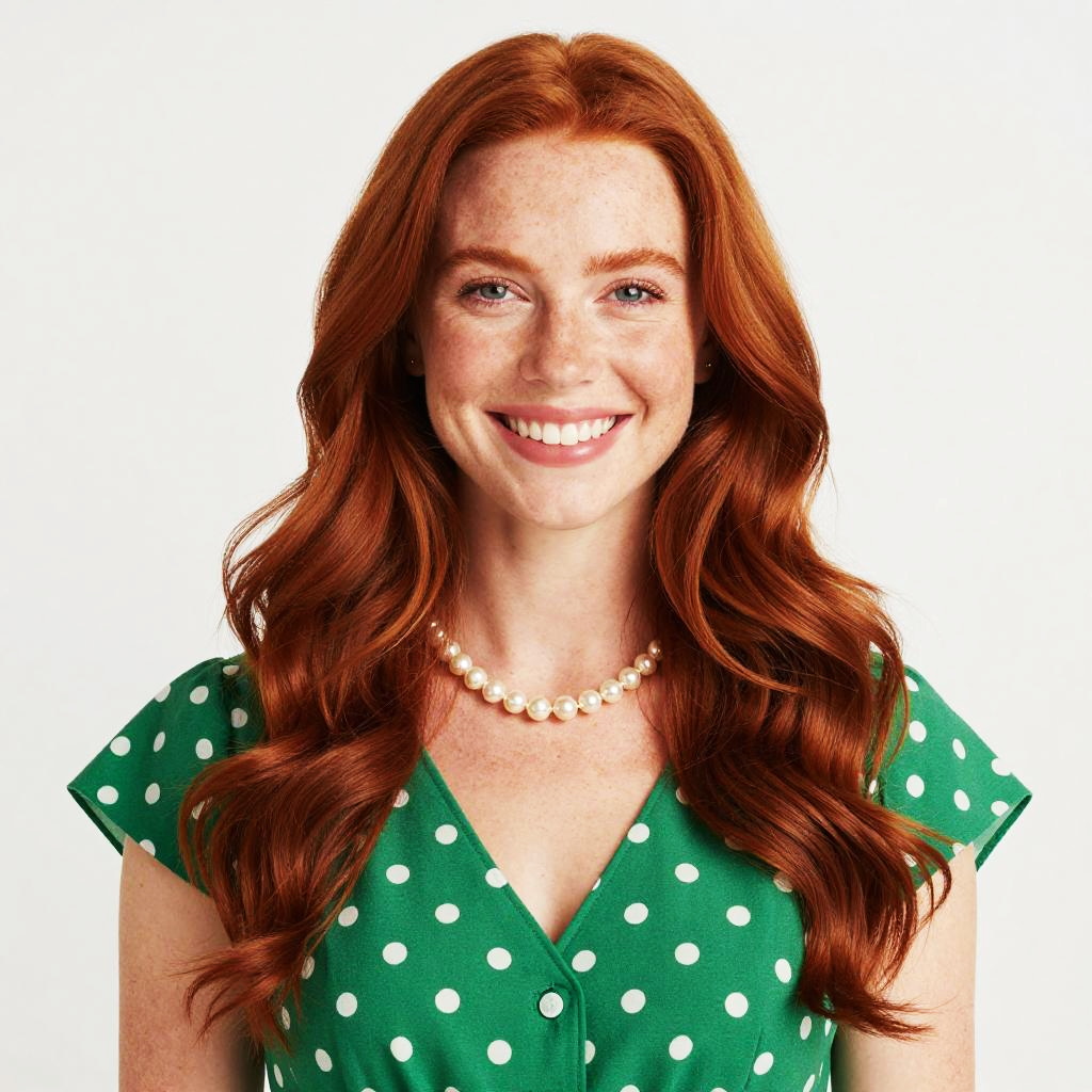 A woman with curly red hair smiles gracefully, wearing a vintage-inspired green dress adorned with white polka dots and floral puffed sleeves. Her look is completed by elegant pearl accessories and green statement earrings, creating a charming blend of classic and contemporary style.