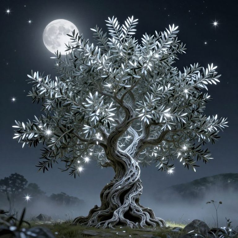 Fantasy-inspired Olivastra olive tree with luminous silver leaves glowing under moonlight, mystical atmosphere, ancient gnarled branches forming intricate patterns, surreal landscape with sparkling stars and soft mist, highly detailed digital art