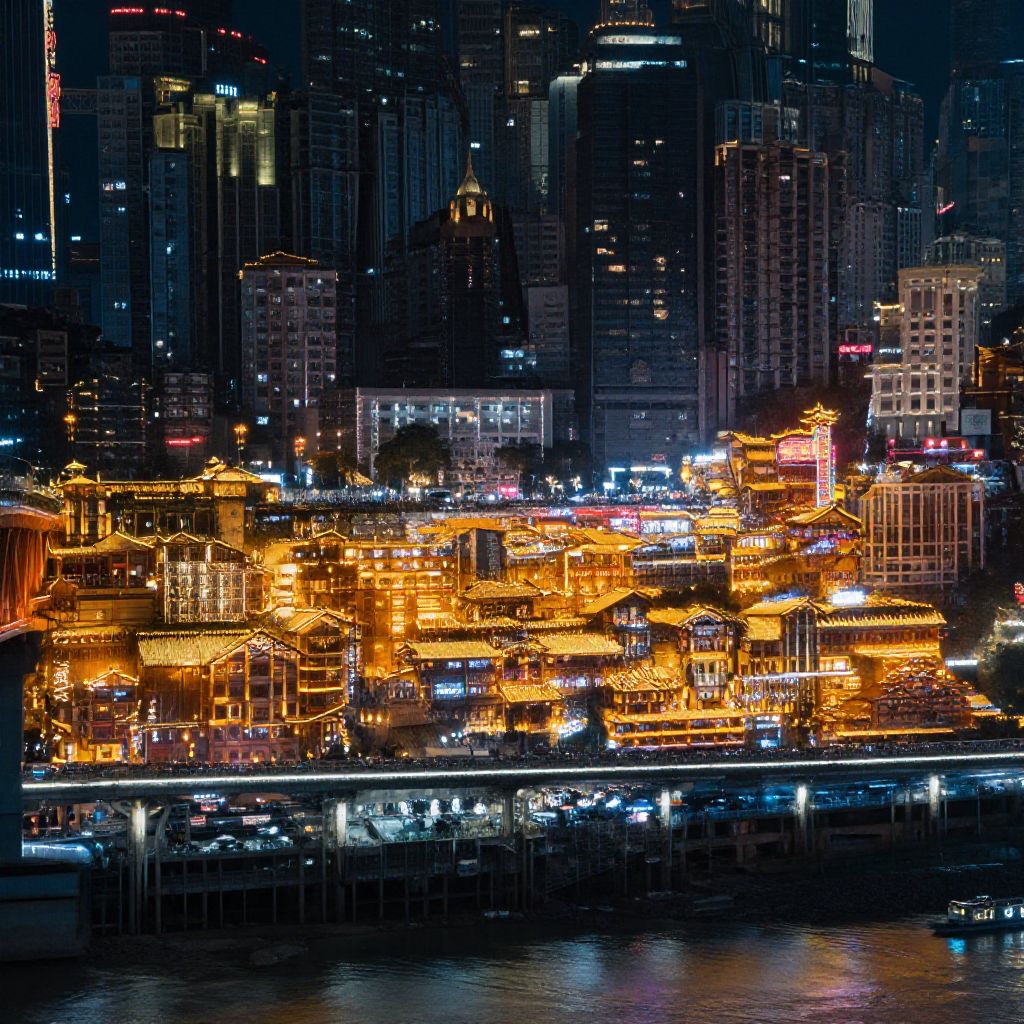 A bustling metropolis at night, showcasing a network of tall buildings with a long, elegant bridge adorned with LED lights stretching across a river.
