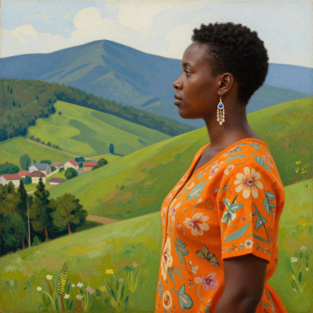 Photorealistic painting of a dark-skinned Black woman with a short, natural Afro hairstyle, wearing a vibrant orange floral blouse with puffed sleeves and black high-waisted pants. She gazes to the left, adorned with large, gold, teardrop-shaped earrings. The background features rolling green hills, a mix of forest and open fields, with a small house and red-roofed buildings nestled among the trees. The sky above is clear with a few scattered clouds. The image combines realistic portrait style with a vivid, almost hyper-realistic landscape, highlighting the contrast between the woman's bright clothing and the lush, green countryside.