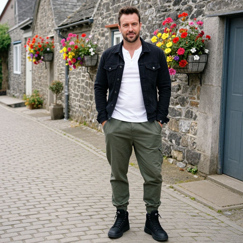 Photograph of a stylish man in a black leather jacket, striped shirt, black pants, and tan boots, standing in a bustling outdoor market with colorful