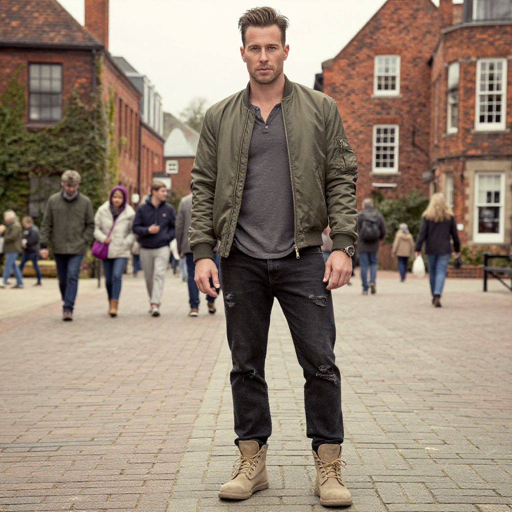 A man, classic black leather bomber jacket, slim-fit black jeans, striped black and white t-shirt, rugged tan desert boots, modern casual look, open-air market vibe, colorful stalls, lively atmosphere, oversaturated film, relaxed smile, engaging with the surroundings. Man has masculine face and piercing eyes