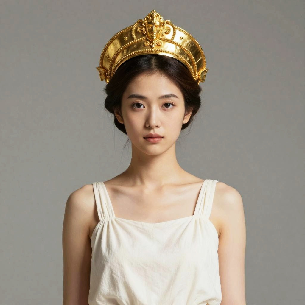 Photograph of an East Asian woman with long, straight black hair and fair skin, wearing a white sleeveless dress. She has a calm expression and is centered in the frame. She is adorned with an ornate, gold crown featuring intricate designs and a central heart-shaped gem. The background is a plain, solid gray, highlighting her regal appearance. The lighting is soft, emphasizing her serene and composed demeanor. The image has a realistic, studio-quality finish.
