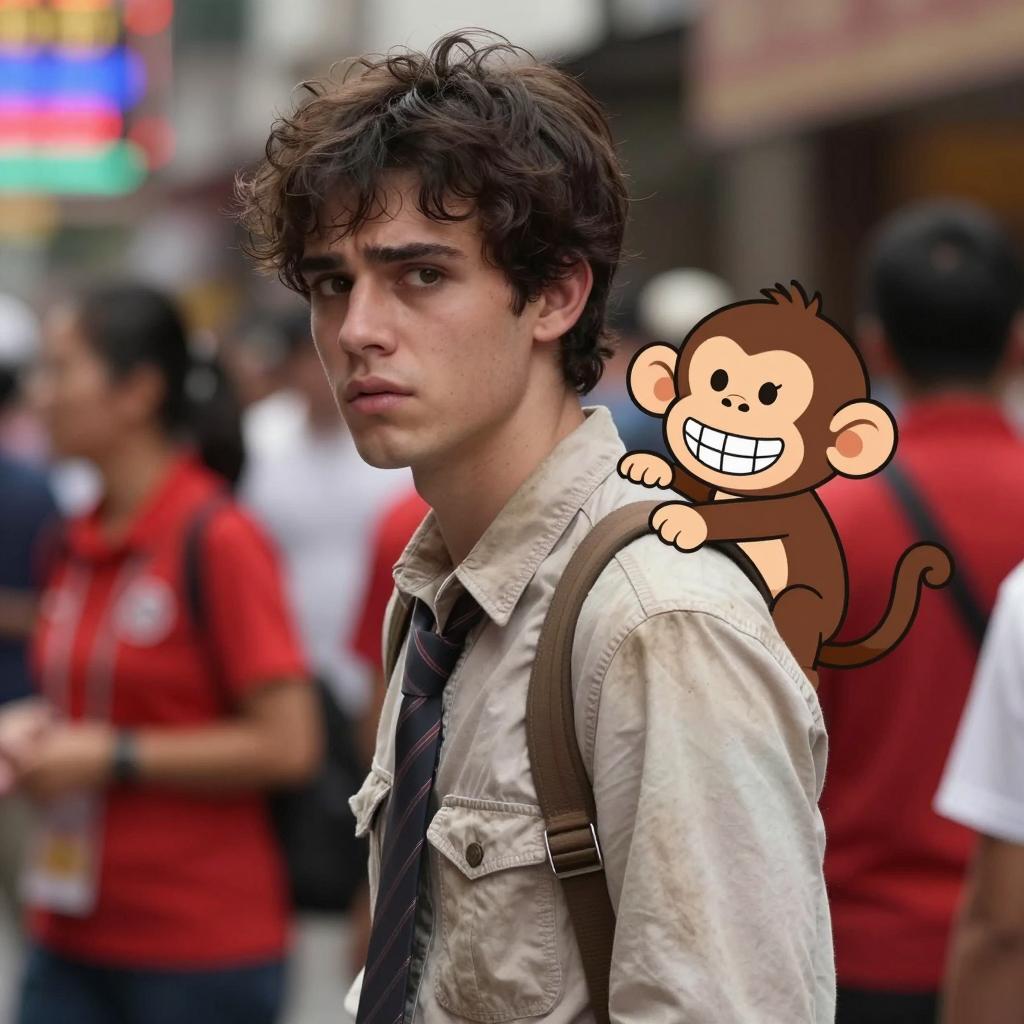 Photograph of a young man with dark hair, wearing a worn, light-colored shirt and tie, looking to the side with a concerned expression. A cartoon monkey with a wide grin and raised hand is perched on his back. Blurred background with colorful lights and people. Multiple people in the background, some wearing red shirts.