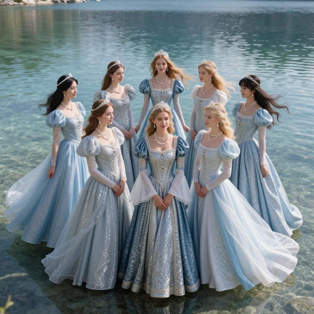 Photograph of seven young women standing waist-deep in a clear, blue lake. They are dressed in elaborate, light blue and silver ball gowns with intricate embroidery and puffed sleeves. Each woman wears a delicate tiara, and their long hair flows gently in the breeze. The central figure is slightly taller, with a prominent tiara and a more elaborate dress. The background shows calm, reflective water with a rocky shoreline. The overall scene evokes a fairy-tale-like atmosphere, with the women's dresses and poses suggesting a regal, enchanting quality. The lighting is bright, highlighting the shimmer of their gowns.