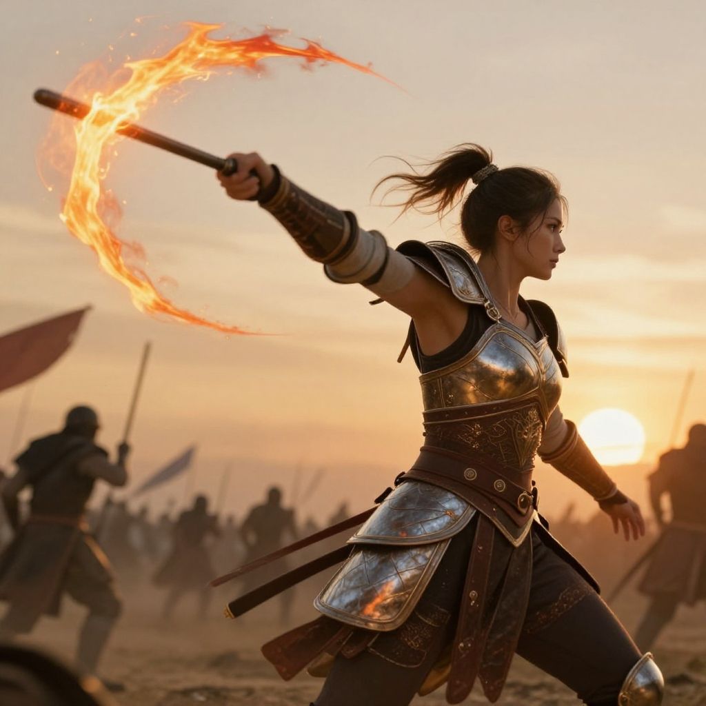 Photograph of a fierce female warrior in metallic armor wielding a flaming sword, silhouetted against a sunset battlefield. Silhouetted soldiers in