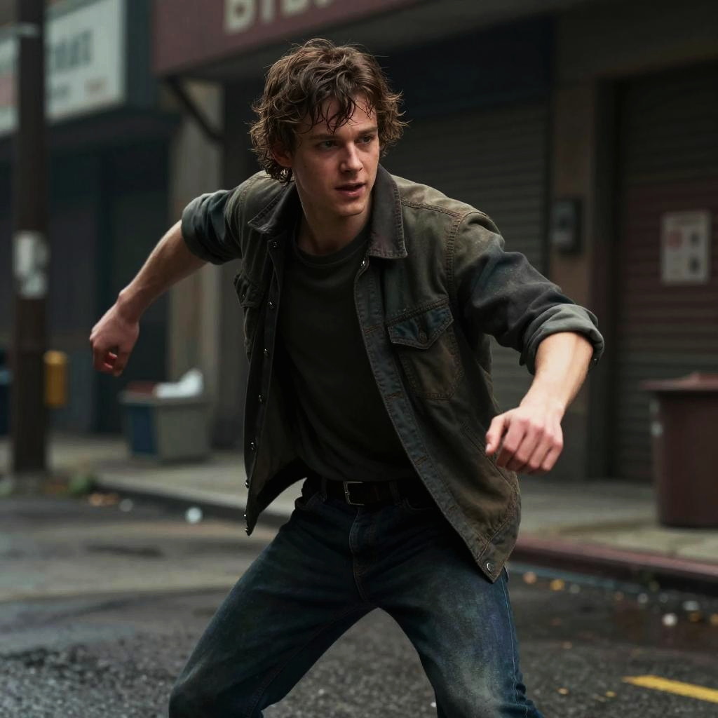Tobin bell young acting in thriller scene, dynamic pose, gritty urban setting, atmospheric lighting, ultra-realistic render
