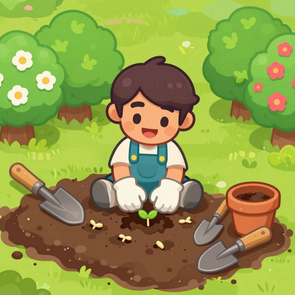 Gardening Bloxburg setting showing a cheerful character planting seeds in rich soil, surrounded by flowering shrubs, garden tools scattered, bright and playful art style