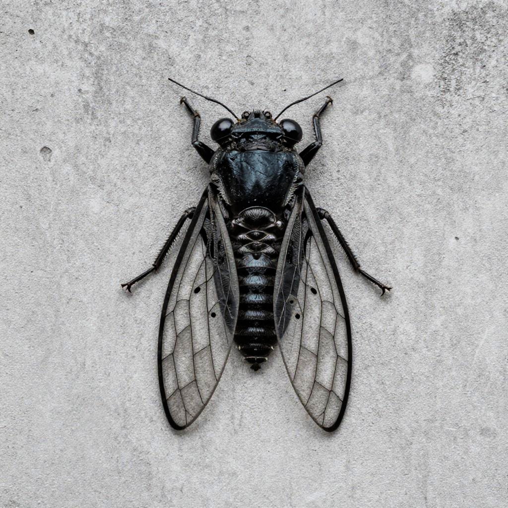 Cicada stencil detailed silhouette, intricate wings and body texture, high contrast black and white, urban graffiti style on cracked concrete wall, sharp edges
