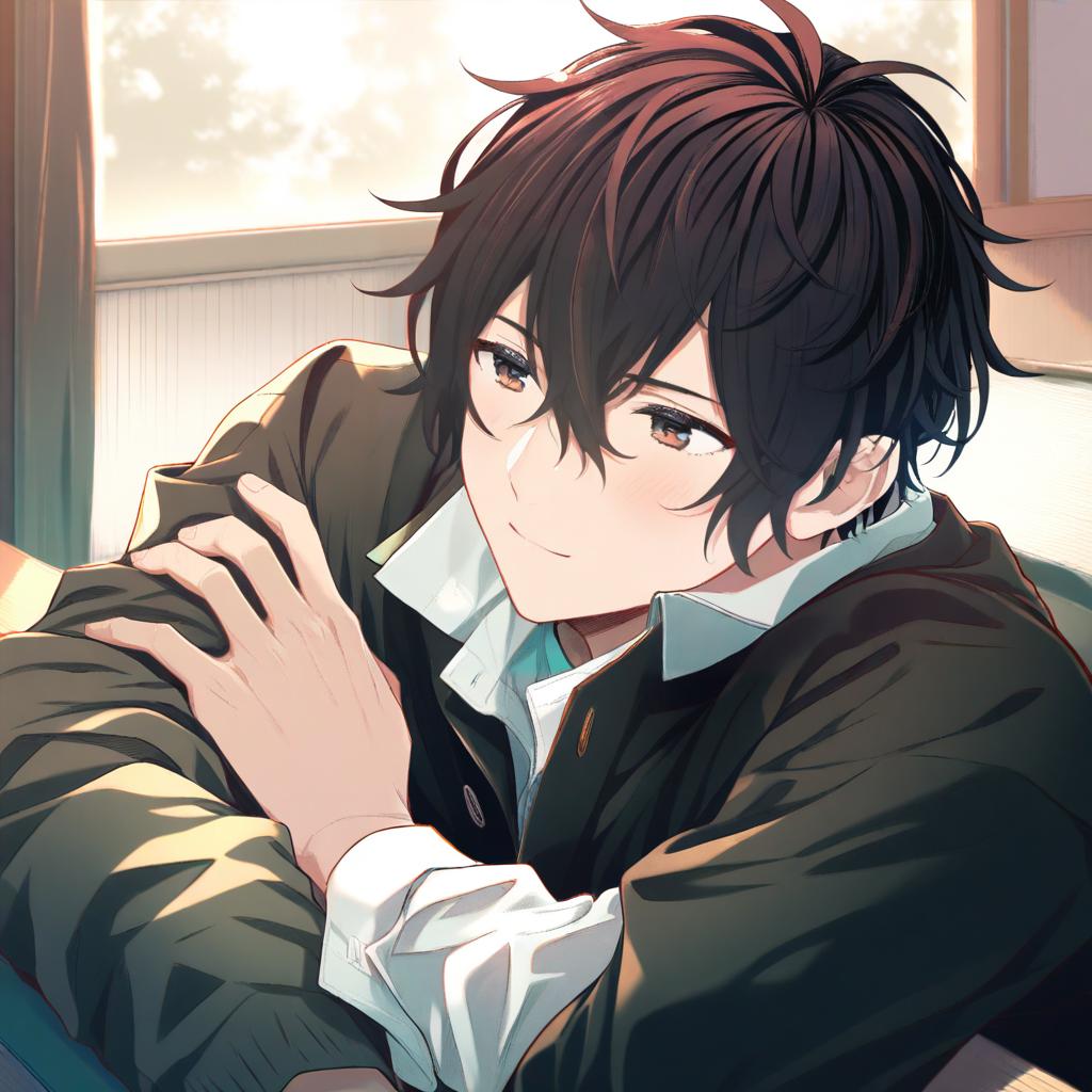 This digital anime-style drawing depicts a young man with short, messy black hair and light brown eyes, smiling softly. He is dressed in a black suit jacket over a white shirt. His hands are gently resting on his lap, and he is leaning slightly forward. The background is blurred, featuring soft, warm lighting with hints of a window and wooden paneling. The artist uses a vibrant color palette with sharp contrasts, emphasizing the character's expressive eyes and gentle smile. The overall mood is calm and slightly introspective.