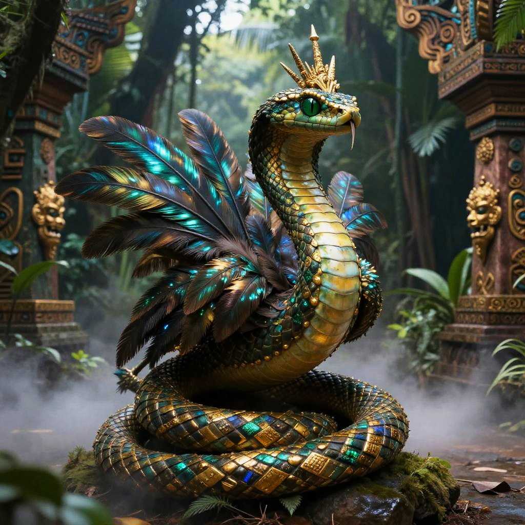 Serpiente emplumada real entwined with ancient gold artifacts, shimmering vibrant feathers and emerald eyes, surrounded by mystical fog in a lost jungle temple, vivid colors and intricate traditional patterns, mystical realism style