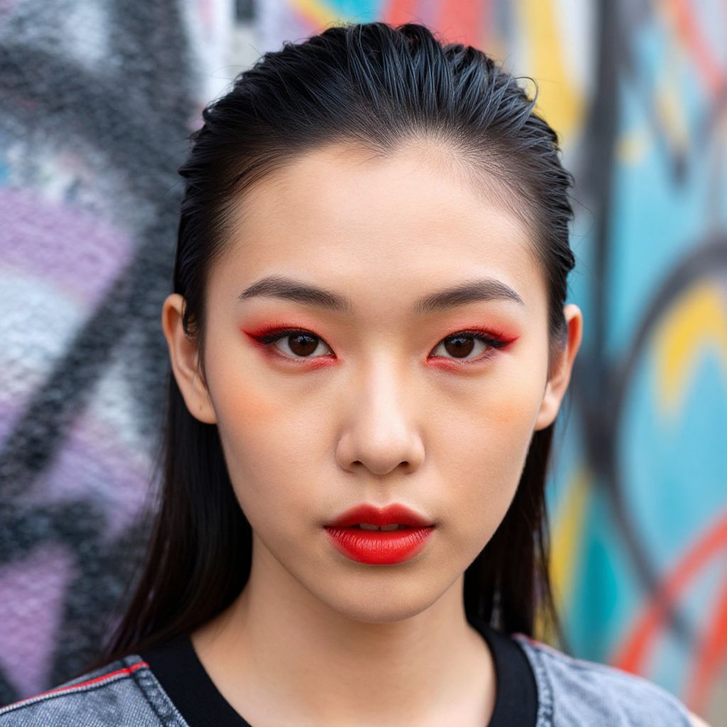 Red eyeliner Asian woman with sleek hairstyle, urban street style vibe, graffiti wall background, energetic mood, vibrant colors, detailed facial features
