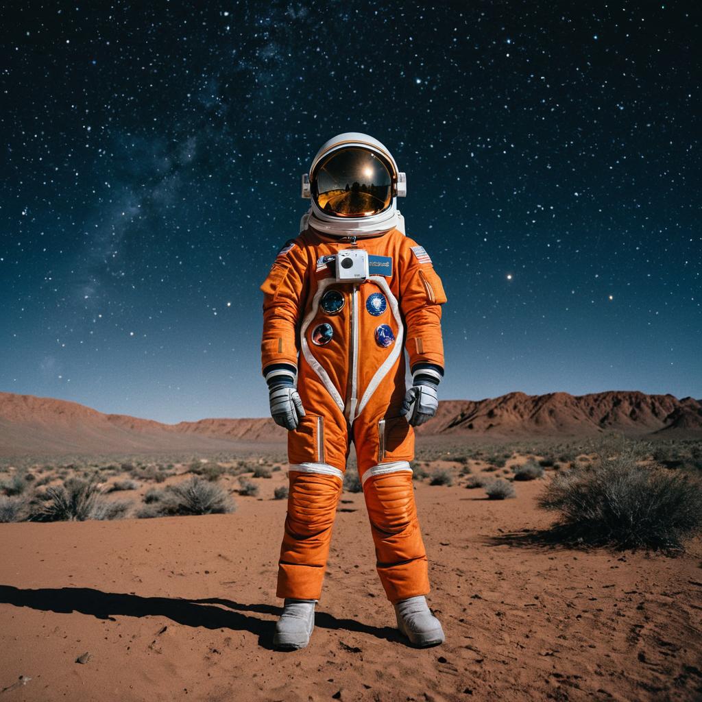 Orange astronaut costume,solo, astronaut, spacesuit, 1boy, male focus, standing, helmet, full body, space helmet, outdoors, star (sky)