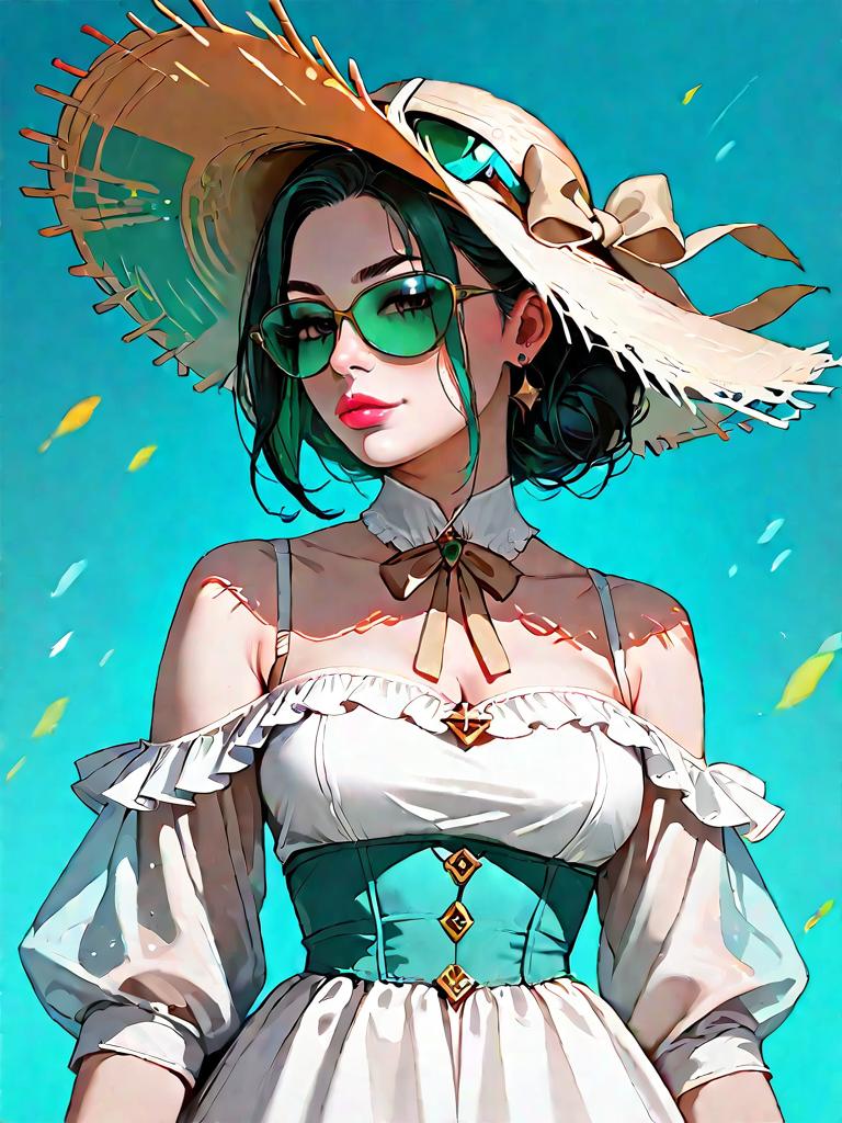 1girl, realistic face, Bodycon dress, sleek silhouette, stretchy jersey fabric, deep emerald green, off-shoulder neckline, intricate lace detailing, paired with a wide-brimmed straw hat, natural fibers, beige ribbon accent, oversized sunglasses, gold frame, chic summer vibe.