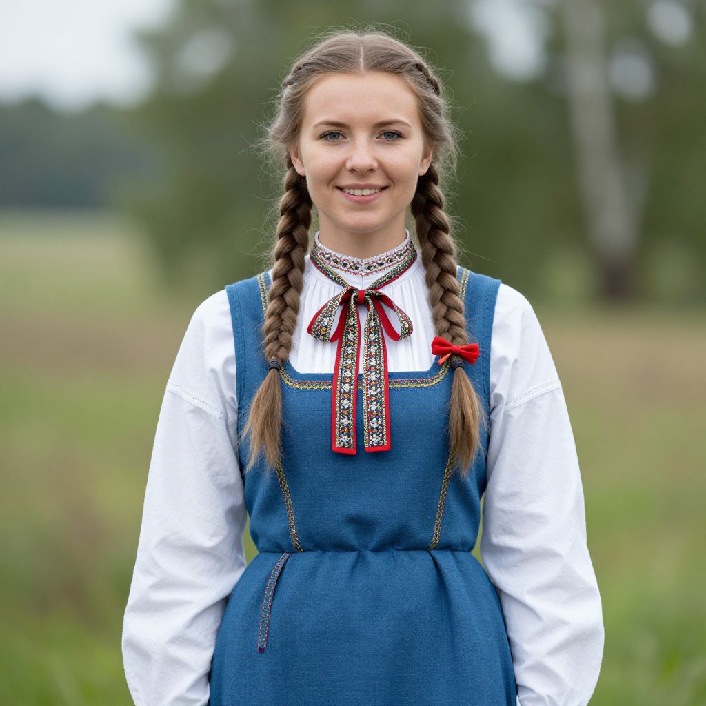 Finnish folk dress, woman in a blue dress with braids and a bow