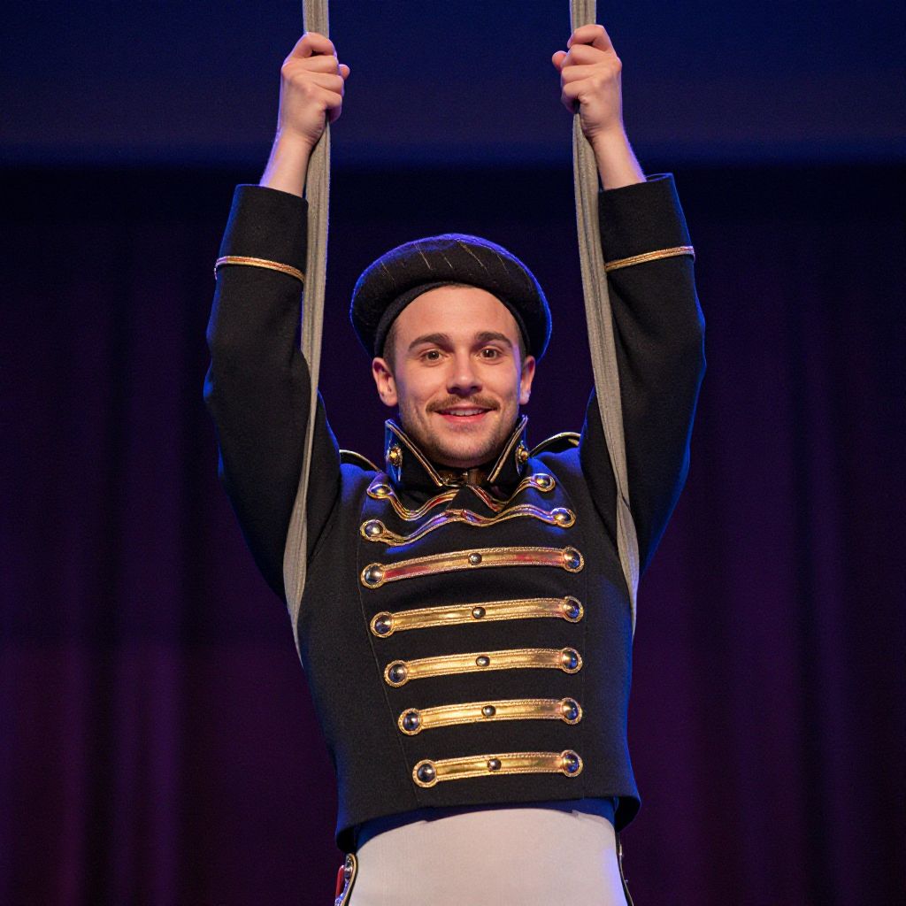 Photograph of a smiling male aerialist with light skin, black beret, and black military-style jacket with gold buttons, hanging from silver bars against