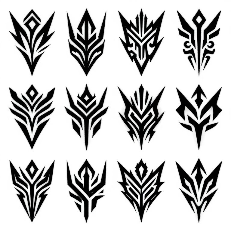 Black tribal-style tattoo designs, each with unique jagged, angular shapes, arranged in a 4x4 grid on a white background. Digital artwork