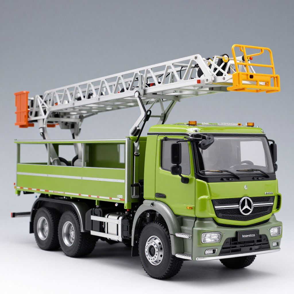 Detailed green Mercedes-Benz L6600 ladder truck model, featuring a 1:18 scale alloy construction with a limited edition of 500 pieces, showcases intricate details including a prominent crane arm, open cargo bed, and iconic Mercedes-Benz emblem, all crafted in China (Mainland).