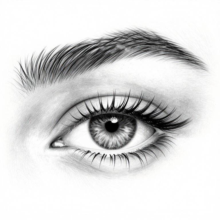A very detailed and highly realistic pencil drawing of an eye with long eyelashes and curved eyebrows, byprzemek bednarczyk, artstation, pencil, black and white, line art, detailed, hyperrealistic