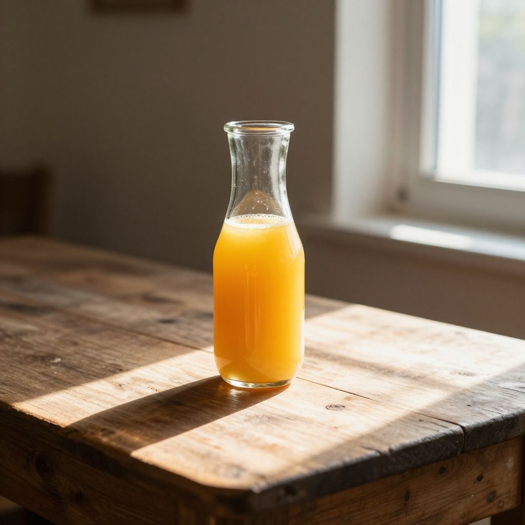 Vintage garafe on a rustic wooden table, filled with fresh orange juice, morning light streaming through a nearby window creating warm, inviting ambiance