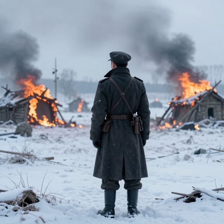 A soldier in a dark winter trenchcoat stands in a frozen wasteland, observing a burning primitive village.