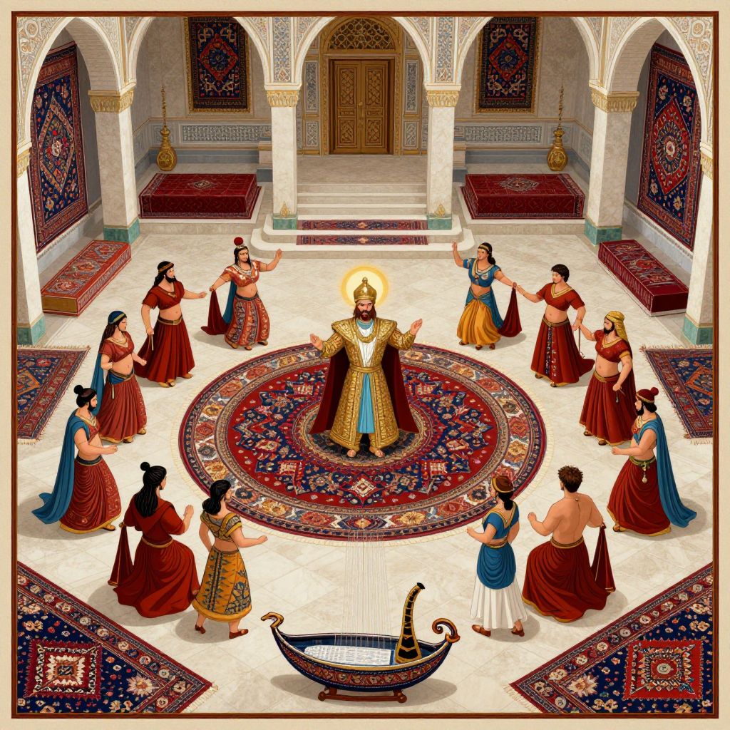 Hand Weaving age of mythology art, civilization game artwork, Suleiman the Magnificent, in his palace in istanbul, surrounded by belly dancers, lots of dories and turkish rugs,