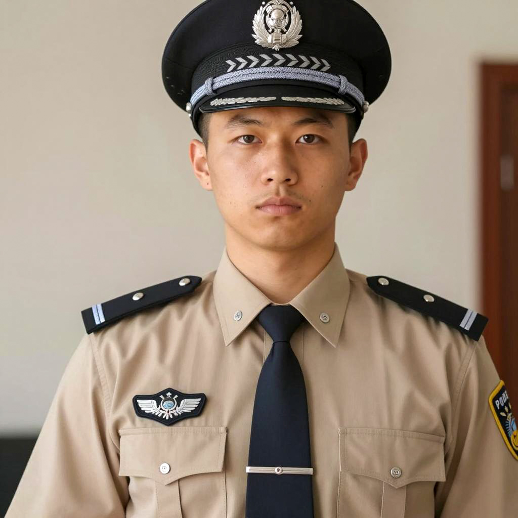 Police officer fancy dress, photorealistic portrait of a serious male police officer, wearing black uniform with police badge, black hat with silver emblem, yellow "POLICE" patch on left chest, blurred outdoor background with trees and blue sky, daytime, medium close-up, realistic lighting, detailed facial features, clean-shaven, light skin, short brown hair, professional and authoritative expression, slight shadow on face, focused gaze