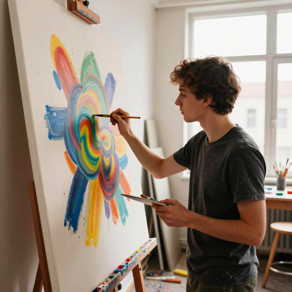 Engrossed young artist painting a vibrant, abstract mural on a large canvas in a sunlit studio, paint splatters and colorful brushes scattered around, natural light streaming through large windows, capturing the passion and dedication of the creative process.