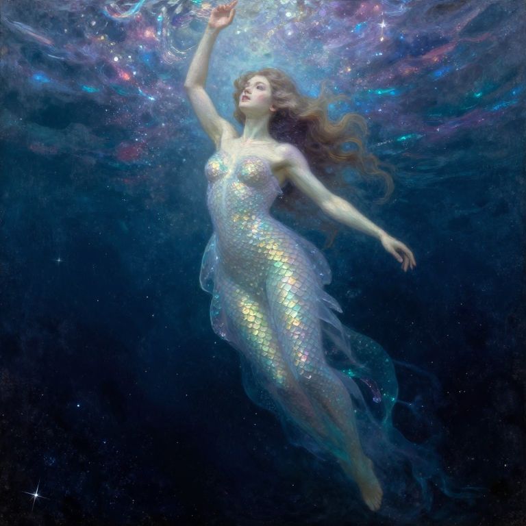 Craft an image embodying dreamlike digital artistry, merging the dark, fantastical elements of Gustave Doré's illustrations with the enchanting color palettes reminiscent of late 19th-century Pre-Raphaelite painters. Depict a mesmerizing mermaid seated on a colossal tree root extending deep into the earth within an ancient forest, surrounded by surreal and impossible flora intricately woven through her flowing hair. Utilize a rich palette of deep hues and vibrant accents to evoke both the magical allure of this mystical creature and the enigmatic darkness shrouding the forest. Capture the scene from an unusual low-angle perspective to highlight the mermaid's luminous gaze and intricate details of her iridescent scales, creating a captivating visual blend of fantasy, nature, and mysterious dreamscapes.