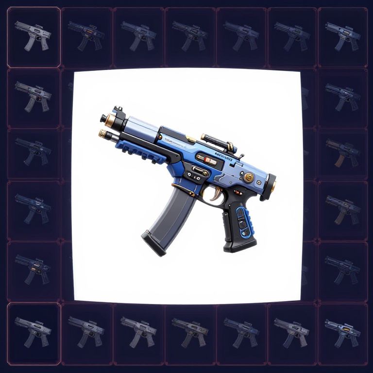 Digital illustration of a futuristic blue and black assault rifle with multiple attachments, centered on a white square background, surrounded by repeating dark blue gun icons.