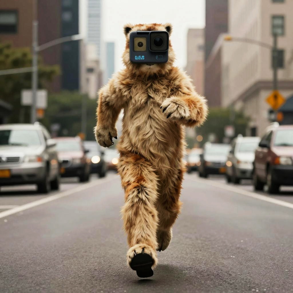 Full-length realistic image of a superhero in a furry animal costume with a GoPro camera mounted on the head running toward the camera on a city street. The urban background features cars and tall buildings with soft shadows and professional color grading, captured in sharp focus resembling film photography.