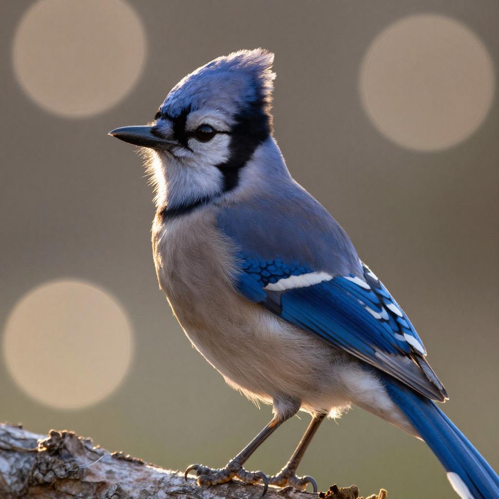 A mesmerizing close-up portrait of a gorgeous little blue jay illuminated by the soft, golden light of a tranquil morning, with vibrant bokeh balls gently framing its delicate form. The image is rendered in sharp detail, capturing every feather and intricate feature of the blue jay with stunning clarity. Soft, diffused lighting enhances the warmth and radiance of its plumage, while the high-quality bokeh adds a touch of magic to the scene. Multiple image exposures are expertly combined to emphasize the blue jay's vibrant colors and captivating gaze. This stunning image is rendered in insanely high resolution, realistic, 8k, HD, HDR, XDR, focus + sharpen + wide-angle 8K resolution + HDR10 Ken Burns effect + Adobe Lightroom + rule-of-thirds + high-detailed bark. Canon EOS 5D Mark III, 1/160s, f/8, ISO 100. The resulting image is a masterpiece of nature photography, with lifelike colors and exquisite details that evoke a sense of tranquil beauty. (tranquil yet evocative:1.2) shimmering digital colors, mixed media, textured paper, overlapping, asymmetrical, abstract, vibrant, many details, extreme detailed, full of details, Wide range of colors. Many details everywhere. soft shadows. Low saturation colors. Insane quality. Insane resolution. Insane details. Masterpiece. 32k resolution. Dramatic, Dynamic, Cinematic