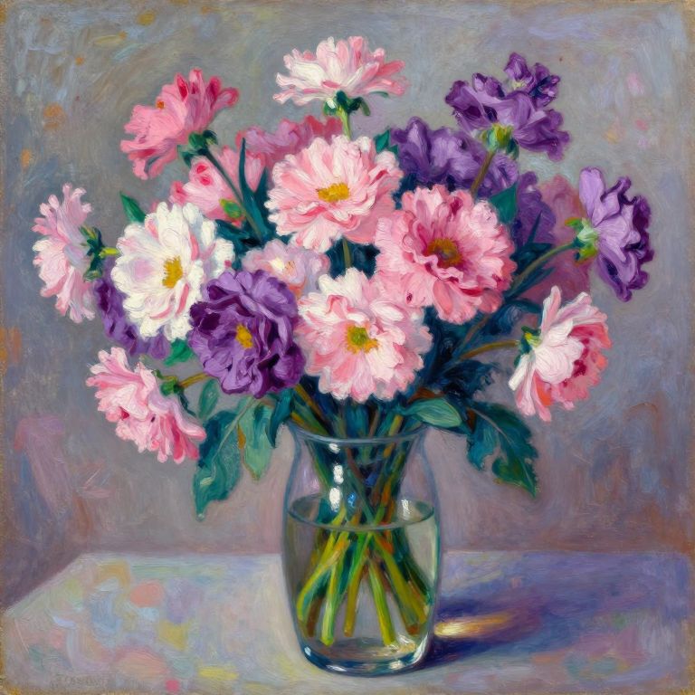 A vibrant still life painting featuring a glass vase filled with a bouquet of pink and purple flowers, rendered in a vivid, impressionistic style characteristic of Theo Van Rysselberghe's oil-on-canvas technique, showcasing a harmonious blend of color and light against a muted background.