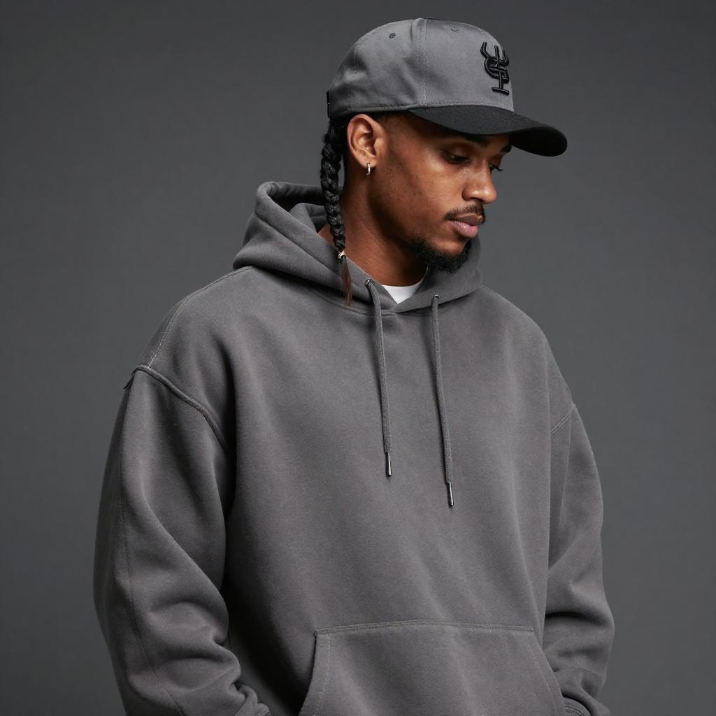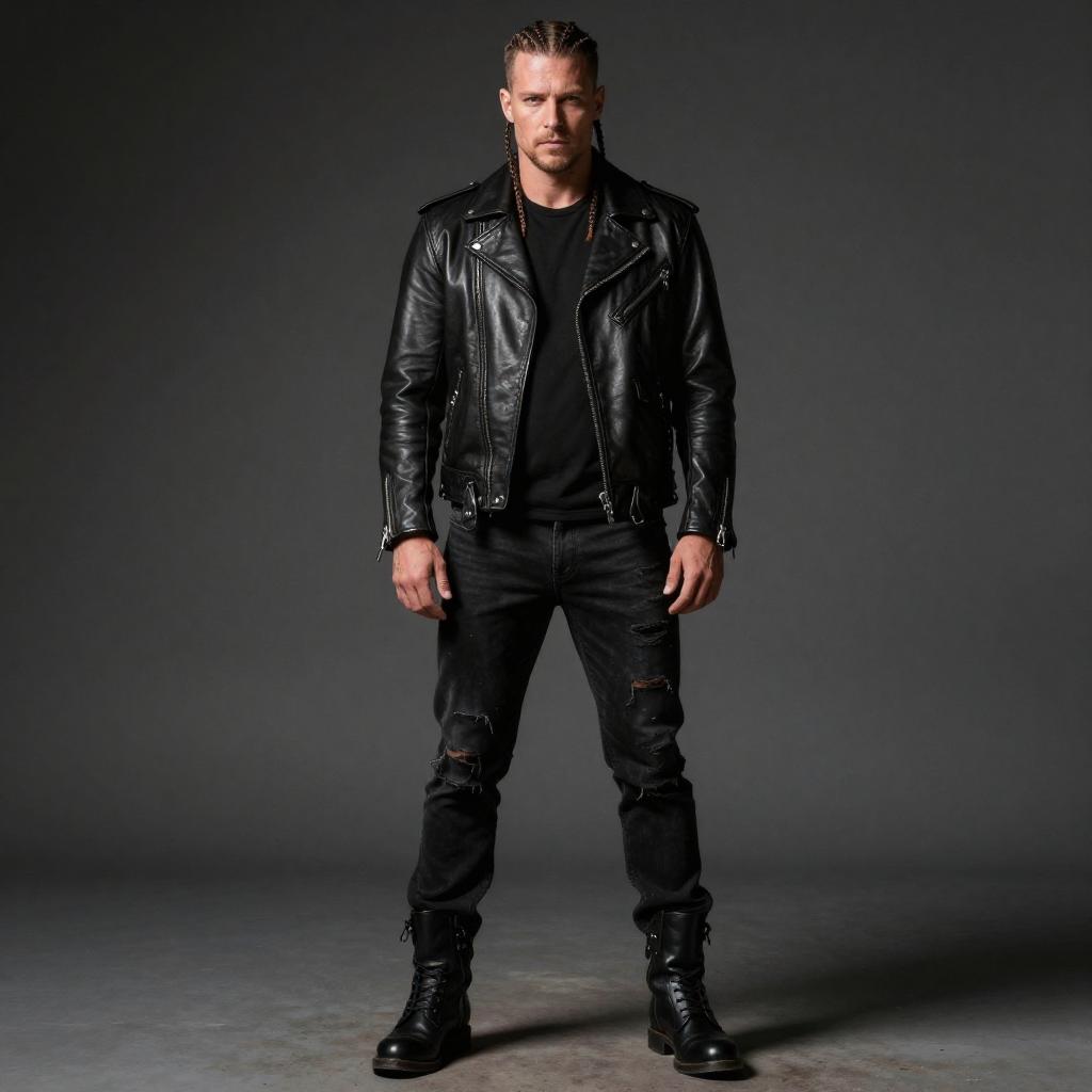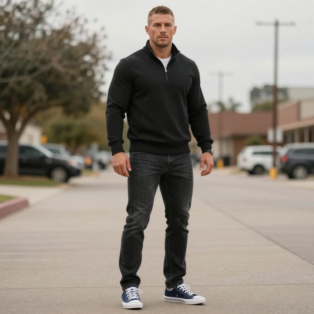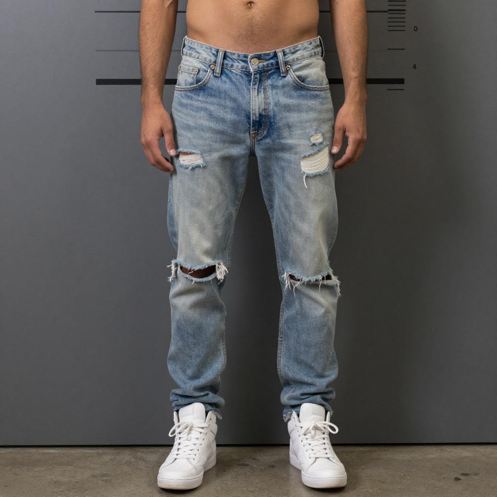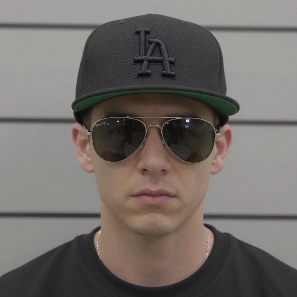 Photo of a Flat Hips man, Slicked Back, travis kelce outfit, Distressed jeans and light wash denim, Snapback cap and black embroidered logo, mugshot style