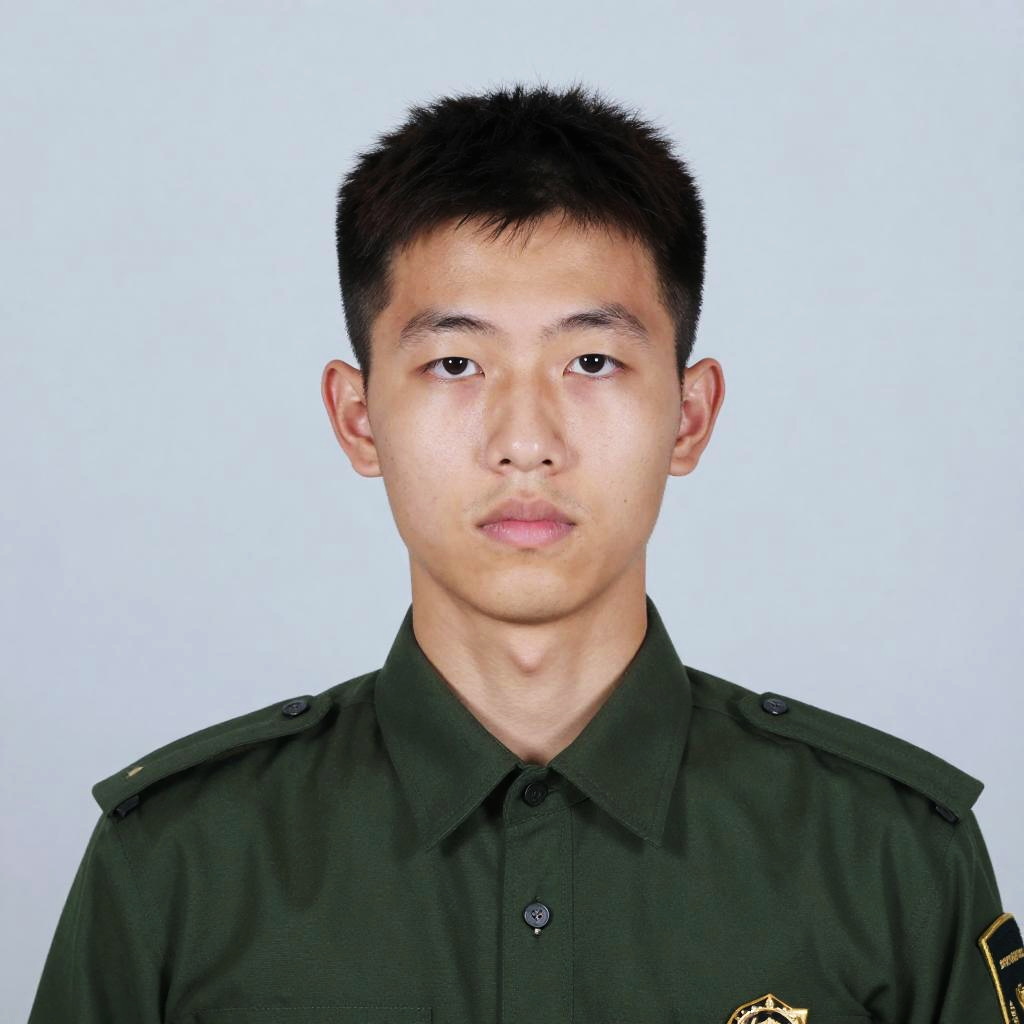 Photograph of a young man with short, dark brown hair and light skin. He's wearing a dark green, button-up uniform with a gold badge on the left side of his chest. His expression is neutral, and he's looking slightly to the right. The background is a plain, light blue-gray, and the image has a slight digital enhancement effect.