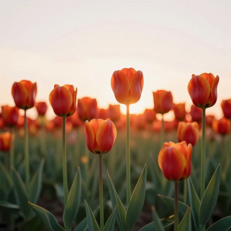 Vibrant red and orange tulips stand tall in a sprawling field, their delicate petals bathed in the warm glow of a setting sun as they sway gently in the soft evening breeze.