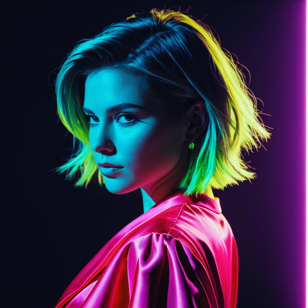 Short Mullet hairstyle on woman, wearing satin gown, in photo studio, captured in fashion editorial style with neon glow.