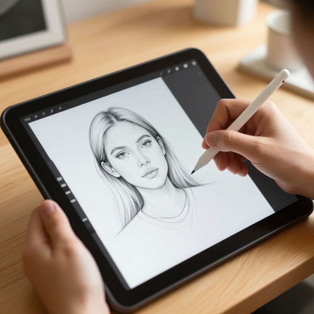 Image sketch converter in action, a hand holding a stylus transforming a realistic portrait photo into a monochrome line art sketch on a digital tablet, artistic vibe, cozy studio environment, warm natural light