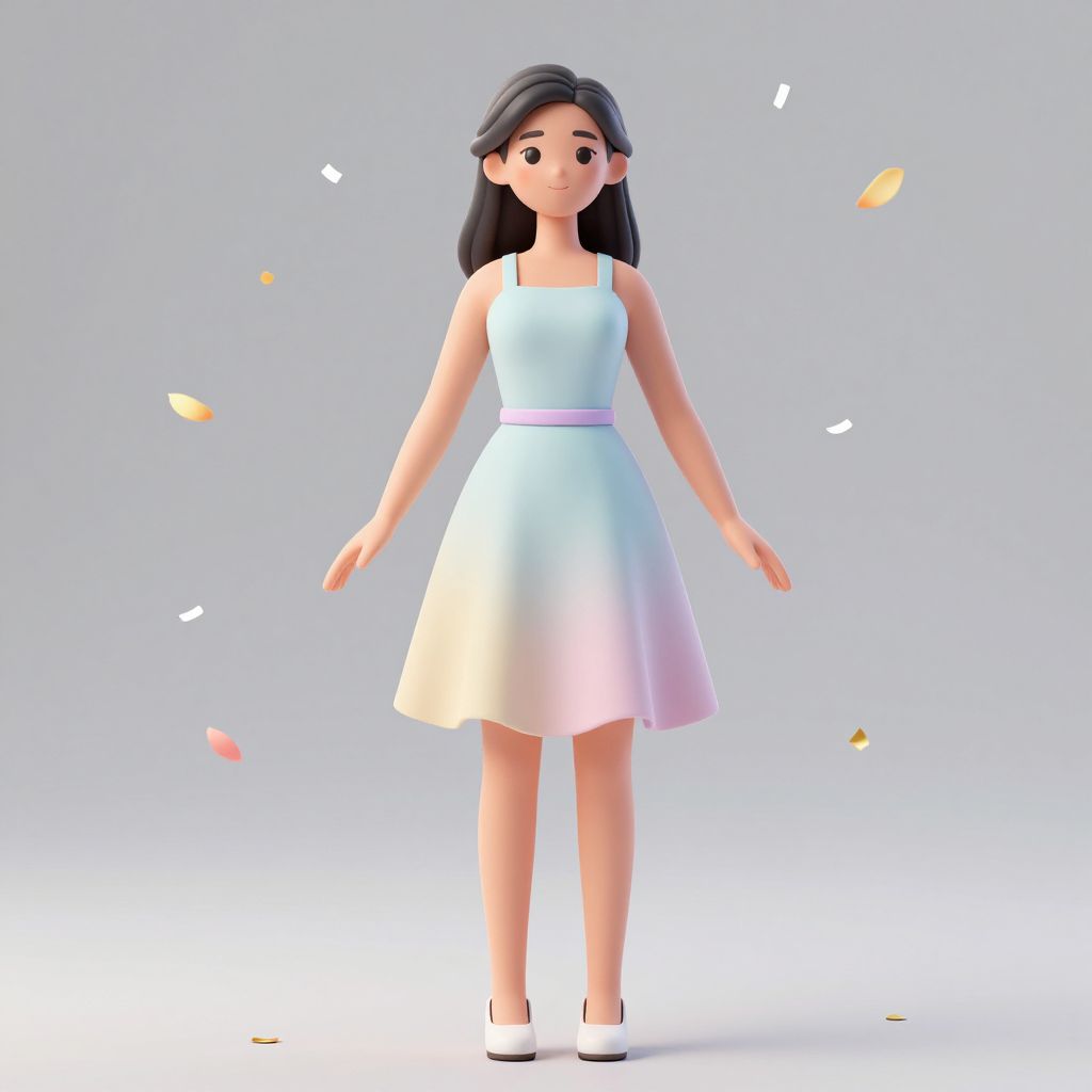 This is a digital 3D CGI image of a young woman with long black hair, wearing a sleeveless, white-to-pastel pink gradient A-line dress with a pink waistband, and white high heels. She has a simple, cute, cartoonish appearance with large, expressive eyes and a small smile. The background is a plain, light gray with colorful confetti pieces floating around her. The image has a soft, slightly glossy texture, and the lighting is even, emphasizing the pastel colors of her dress. The overall style is whimsical and minimalistic.