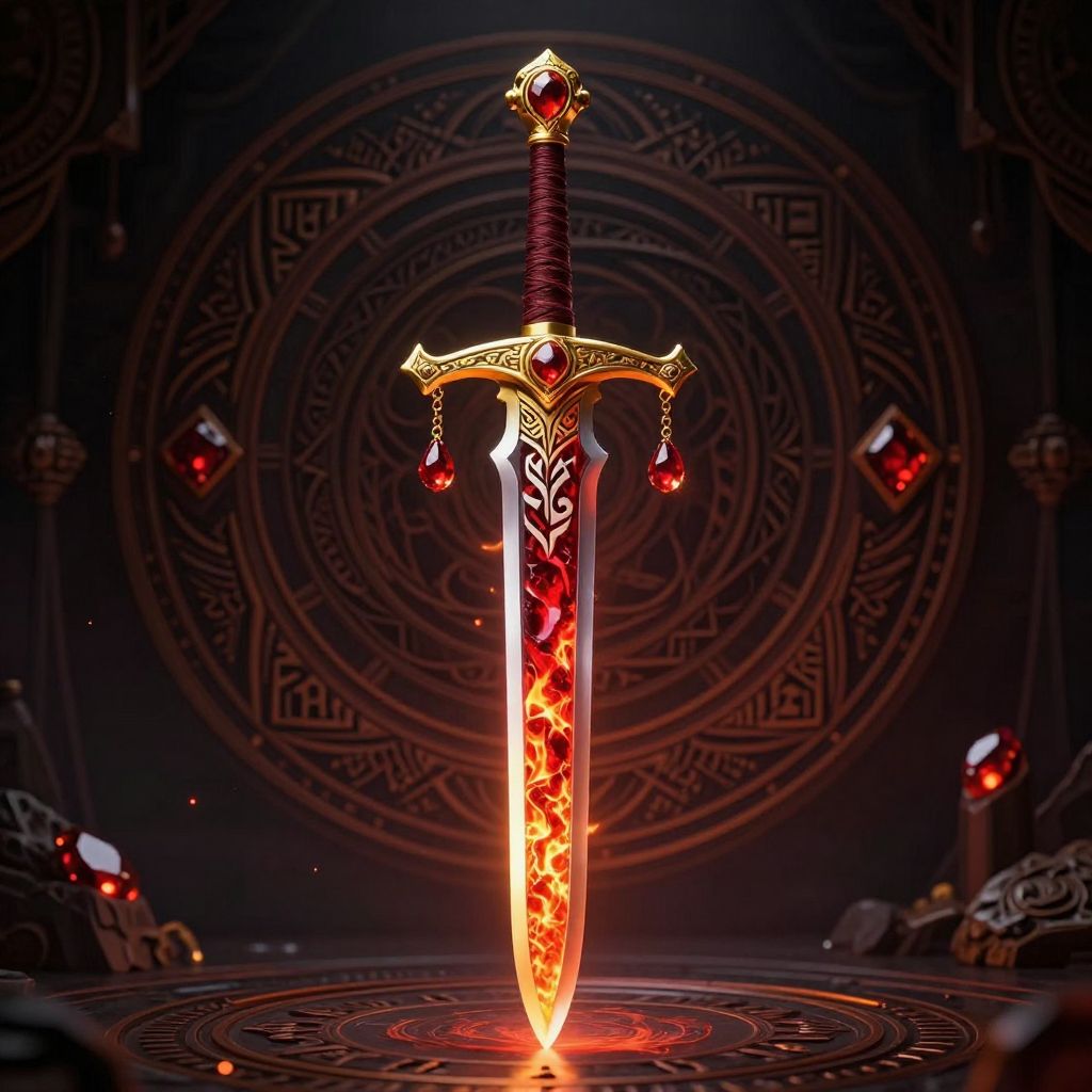 Glowing, fire-embellished sword with intricate designs and red gem pommel, centered on magical, circular dark background with red orbs